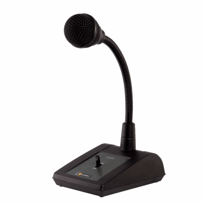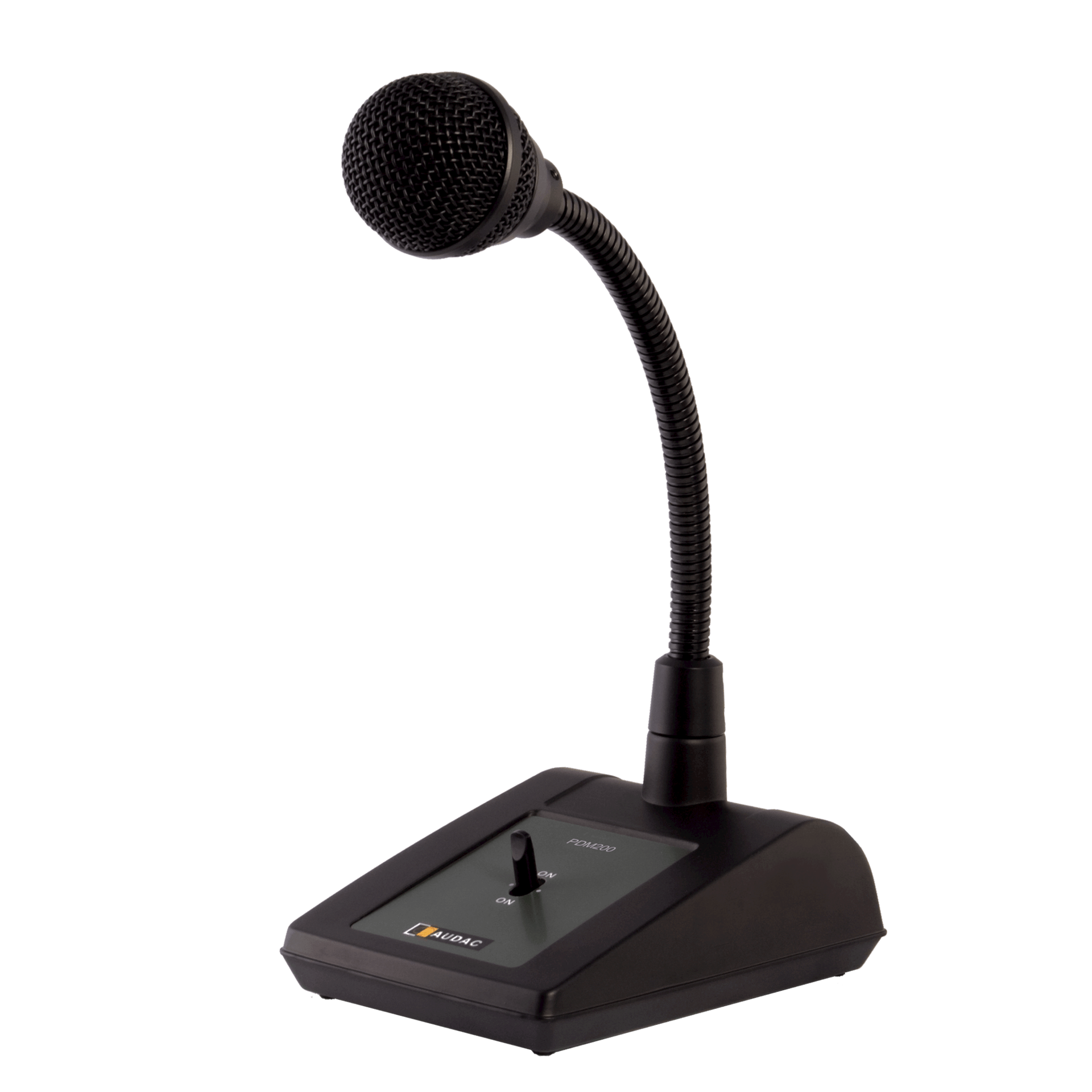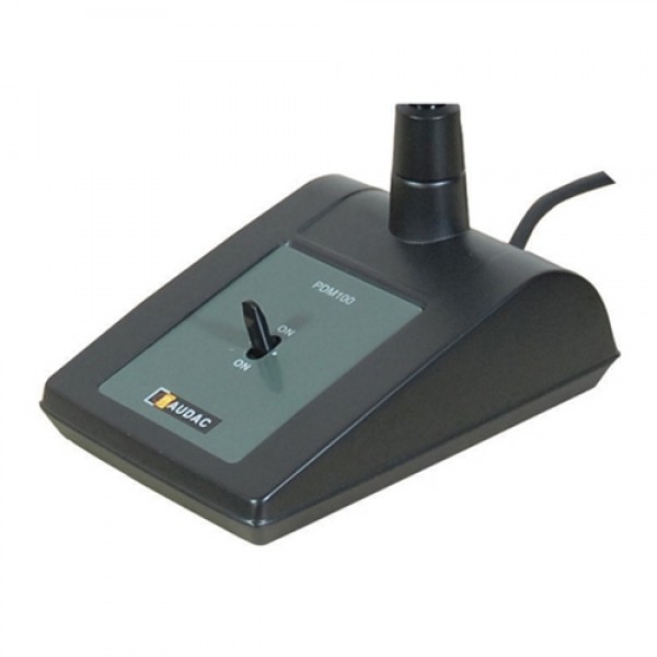 The PDM200 paging microphone is a polyvalent dynamic gooseneck microphone, mounted on a solid, very stable base and fitted with a three function switch with functions: Permanently ON / Momentary ON / OFF. It is equipped with a switch contact and integrated RC network for use with chime modules. By means of the integrated switch contact and RC network, the PDM200 can activate the chime module of AUDAC COM12/24 or many other public address amplifiers. Its suitable for announcements in all different kinds of environments, ranging from small retail stores and offices to warehouses, large public buildings or big office buildings. A connection cable with a length of 1.5 meter, fitted with a 3-pin XLR connector and connection wires for the chime contacts is attached.