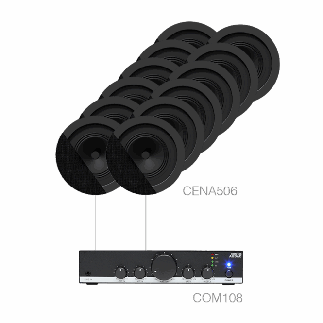 The CANTO5.12 set is composed of the CENA506 full range ceiling speakers with borderless grill design. The CENA506 provides a clear and intelligible sound, suited for versatile 100 Volt background music and announcement systems. Powered by a COM108 amplifier, great flexibility for connecting sources and microphones is offered. This system, using twelve CENA506 ceiling speakers, can cover areas of around 200 m2.