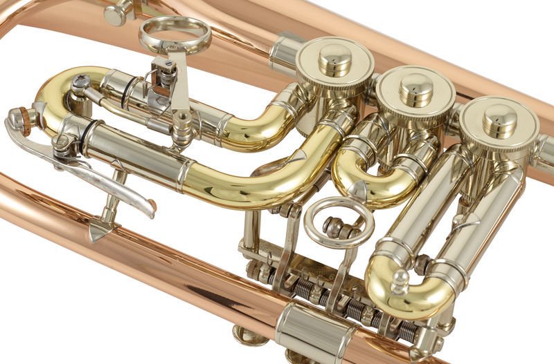 Izvrsna flugelhorna u kombinaciji: bakarno zvono, Silverplated liding pipe i zlatno lakirano kućište za ventile. Stara mehanika sa miniball nikl-silver akcijom.
