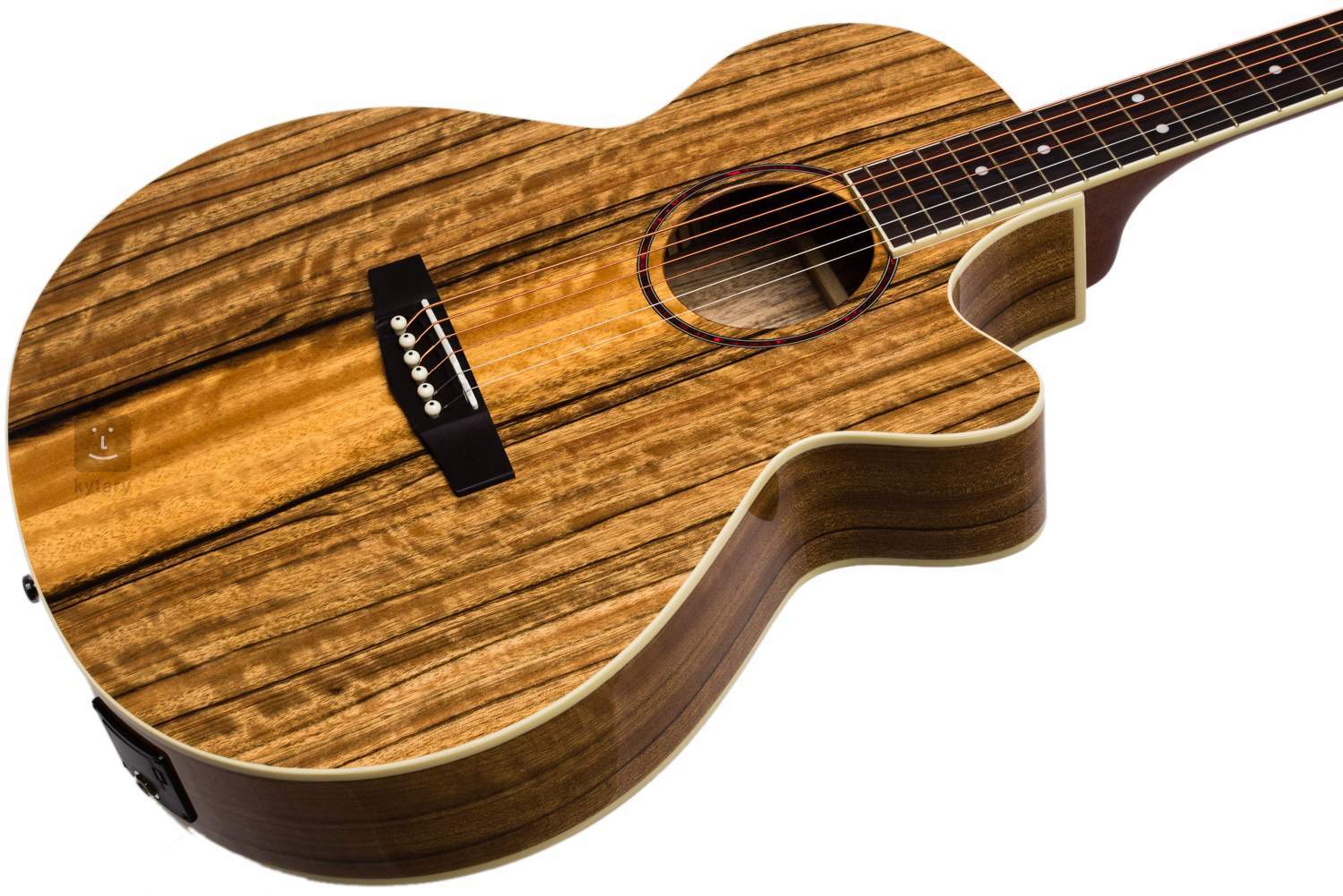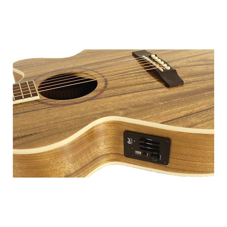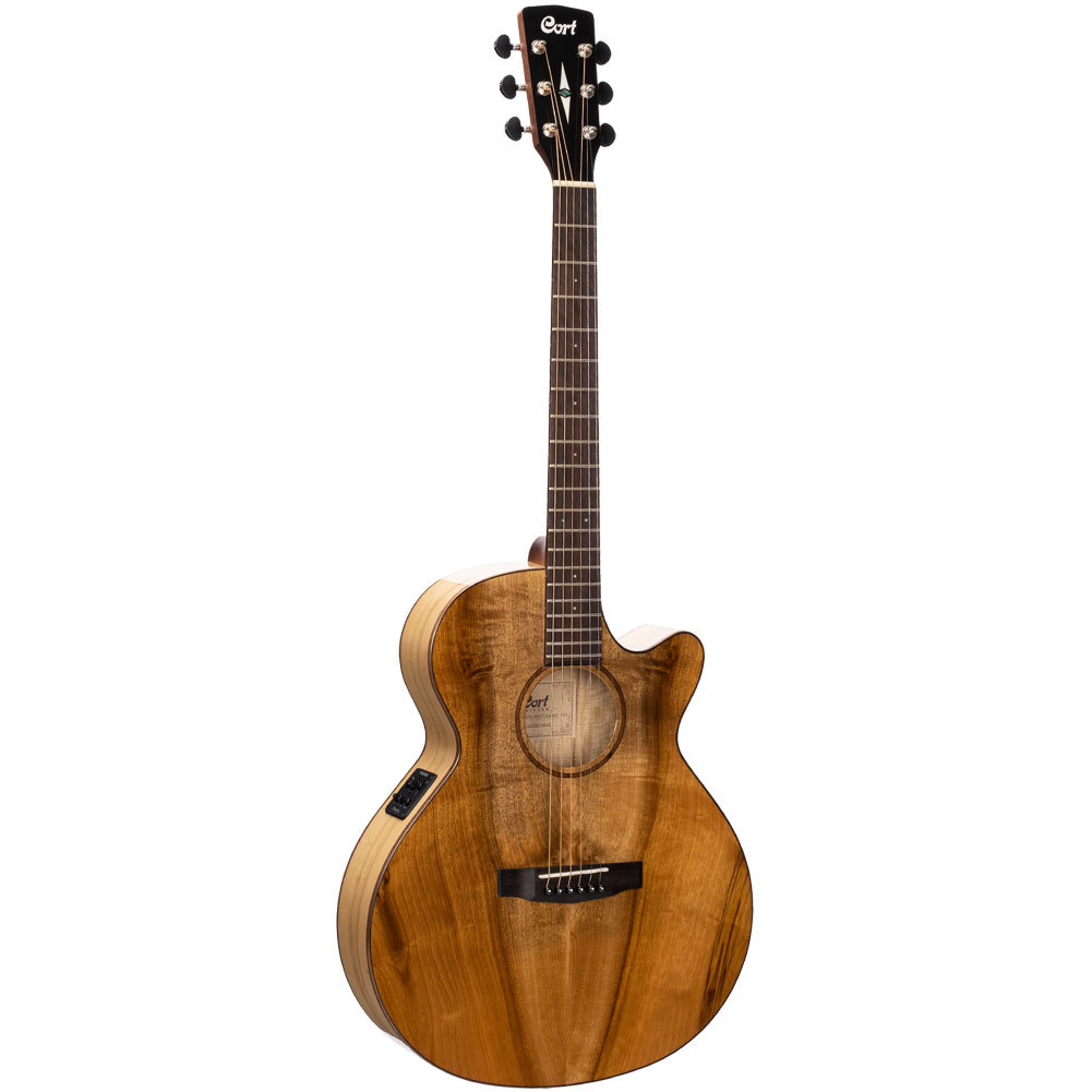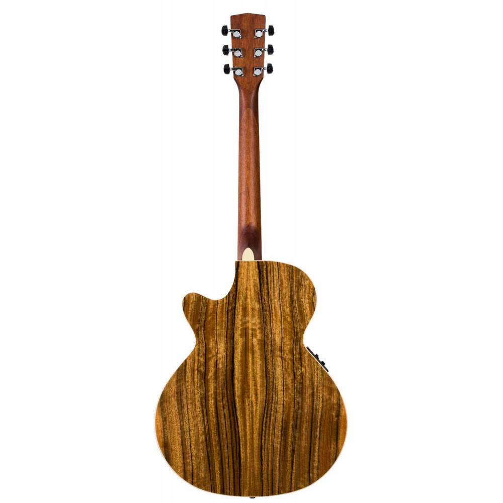 CORT SFX-DAO NAT akustična gitara je moderna elektroakustična gitara. Gitara nudi usko telo sa donjim izrezom za bolje usklađivanje na visokim pozicijama, moderan brzi vrat sa V profilom, džambo pragove i visokokvalitetnu elektroniku.Telo ove gitare je u potpunosti napravljeno od slojevitog egzotičnog daoa sa karakterističnim izgledom drveta. Vrat od mahagonija je zalepljen na telo napravljenu od istog egzotičnog merbau drveta sa 20 pragova. Izgled instrumenta je poboljšan imitacijom poveza slonovače i imitacijom rozete sedefa. Ozvučenje obezbeđuje Cort CE304T pretpojačalo sa integrisanim štimerom.