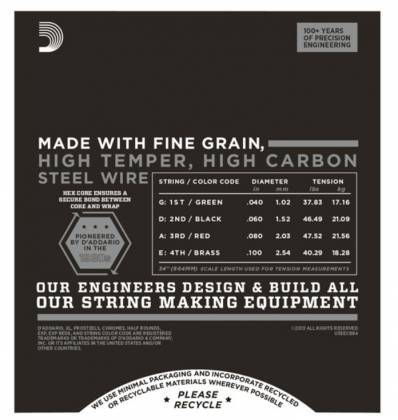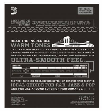 DAddario ECB 84 je popularni D’Addariov hibridni prilagođeni lagani Flatvound set koji kombinuje visoke žice ECB80 (.40 i .060) i niske žice ECB81 (.80 i .100).Ove DAddario Chromes bas žice su namotane spljoštenom žicom od nerđajućeg čelika koja je polirana do neverovatno glatke površine.