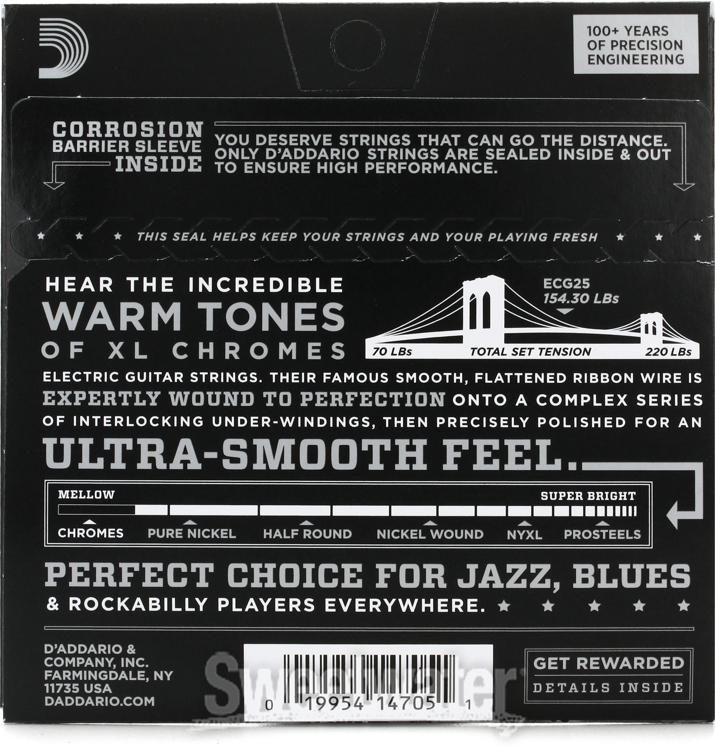 D’Addario ECG 25 Chromes Flat wound su posebno dobre za sviranje džeza. Dobivši sjajne kritike velikana džez gitare poput Džona Skofilda, ove žice su pouzdane i garantovano zadovoljavaju vaše muzičke potrebe. Žice imaju blag i topao ton koji je savršen za džez. Izrađene su od spljoštene trakaste žice od nerđajućeg čelika zbog čega imaju uglačan, gladak i lak osećaj za prste. Svaka žica D’Addario precizno je namotana oko šestougaone čelične žice sa visokim ugljeničnim čelikom. Ovo garantuje jasnu intonaciju, čvrste osnove i izvrsnu doslednost u svakom nizu. Napetost jezgra je visok, zbog rigoroznog kontrolisanog procesa izrade i trostrukog poliranja, koji rezultira dugotrajnijom i skladnom bogatom žicom.