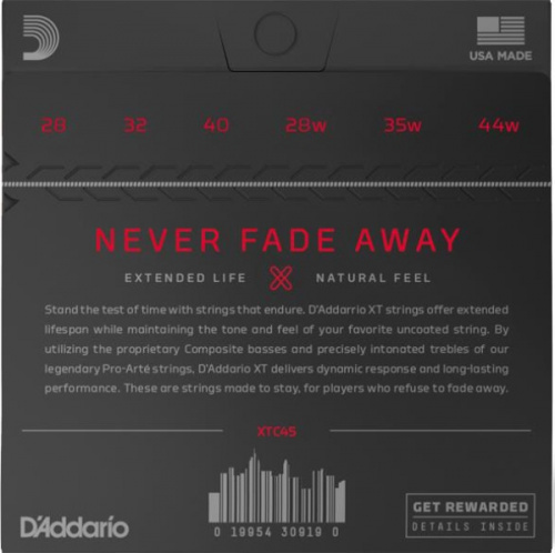 XT su najdugotrajnije klasične žice, koje kombinuju vekove D’Addario ekspertize sa modernom tehnologijom premaza. XT Classical sadrži kompozitne basove, napravljene od dugotrajnog multifilamentnog jezgra, umotane u posrebreni bakar i završene vlasničkim XT premazom, za hrabar, projekcijski ton i produžen životni vek. Dopunjuju ih naše precizne Pro-Arte najlonske visokotonske žice koje pružaju topli, blagi šarm koji vole tradicionalisti. Ovaj set normalne tenyije je najprodavaniji set, preferiran zbog ravnoteže bogatog tona, ugodnog osećaja i dinamične projekcije.