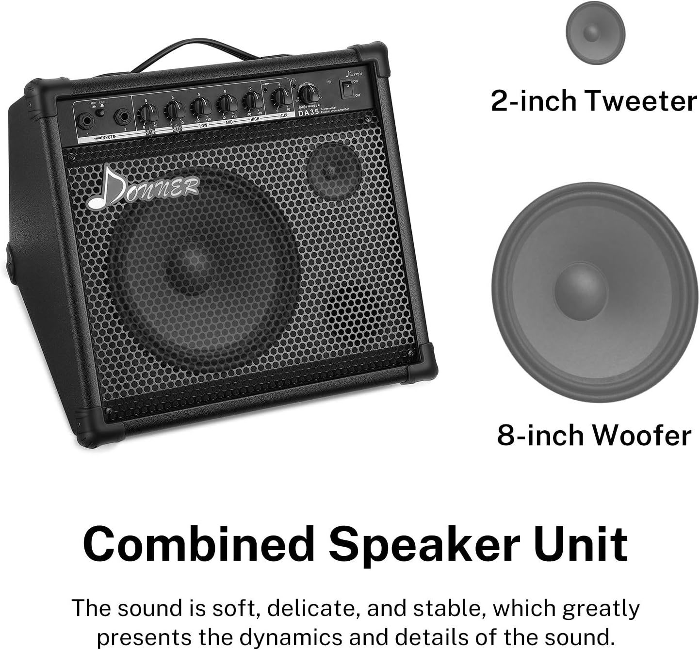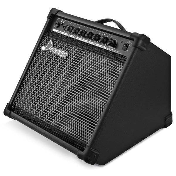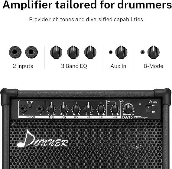 Donner DA-35 je pojačalo sa visokim izlazom razvijeno specijalno za elektronske bubnjeve i elektronske udaraljke zasnovane na karakteristikama zvuka. Dostupna su 2 signalna ulaza za linijski i mikrofonski ulaz. Idealno je pojačalo za računare, pametne telefone i druge uređaje za reprodukciju zvuka. DA-35 podržava BT bežični ulaz uređaja pored AUX IN. Dugmad na panelu zvučnika pojačala se takođe mogu koristiti za kontrolu bežičnih uređaja. Zatvoreni dizajn pruža odličan odziv basa, a ivice su okružene tvrdim materijalom kako bi se pojačala zaštitila od oštećenja.