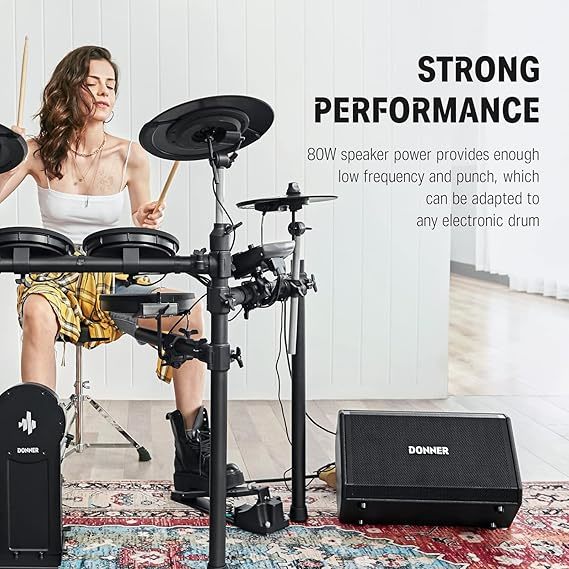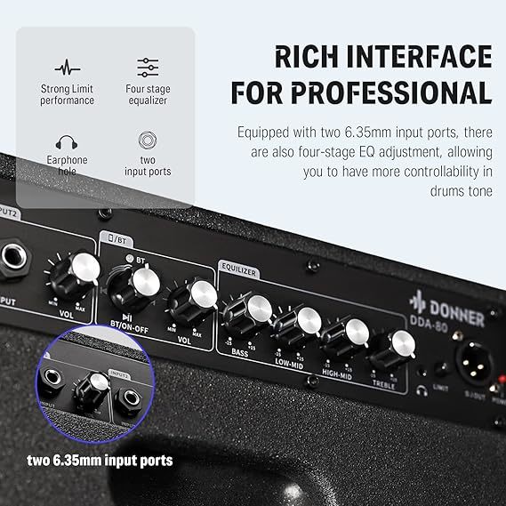 Multimedijalna funkcija DDA-80 omogućava muzičarima da povežu svoje mobilne uređaje sa DDA-80 bežično i kontrolišu sve preko multimedijalnog kontrolnog dugmeta na pojačalu. Donner DDA-80 profesionalni monitor za elektronski bubanj, opremljen sa 8″ vuferom i visokotoncem, koji može da obezbedi i više nego dovoljno prostora za bilo koji elektronski komplet bubnjeva sa audio izlazima. Jedinstveni granični prekidač može efikasno da potisne signal preopterećenja u bubnju i na odgovarajući način smanjite nepotreban dinamički prostor kako biste povećali glasnoću celokupnog seta bubnjeva, tako da se zvuk seta bubnjeva može bolje integrisati u bend.