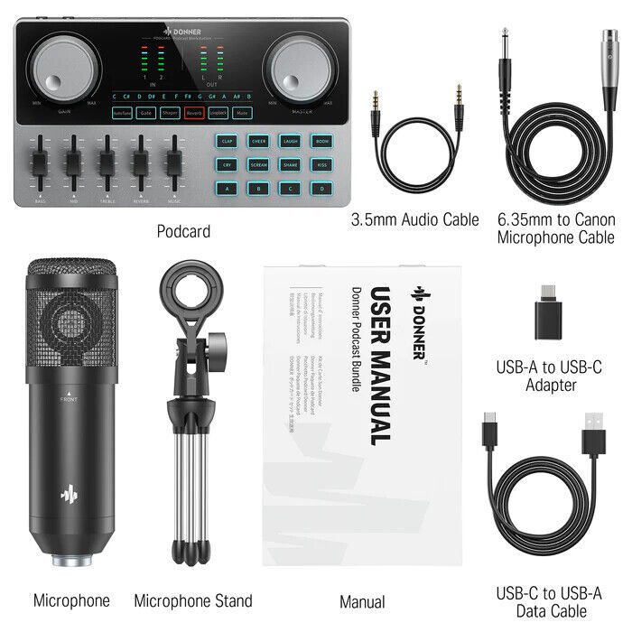 Donner sve-u-jednom Podcast Bundle integriše opremu za miksovanje zvuka u sveobuhvatno rešenje za striming emitovanja. Zvučna kartica nudi odličan kvalitet zvuka i intuitivnu kontrolu za optimizaciju zvučnih efekata. Donner komplet za podcast je jednostavan za rukovanje, odličan je za početnike koji bi želeli da počnu da rade podkastove ili da ga koriste za strimovanje vaših igara.