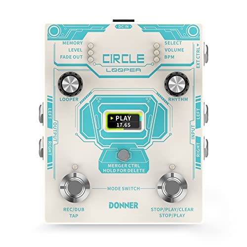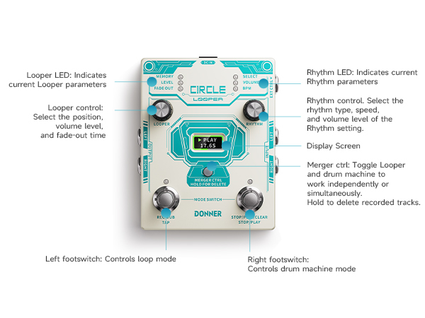 Donner Circle Looper razvija najnoviju generaciju Donner looper efekta, bliže potrebama korisnika u funkcionalnosti. 44,1 kHz 24-bitni visokokvalitetni looper i bubanj mašina. 100 različitih bubnjeva iz 10 jedinstvenih muzičkih stilova. 10 tipova podešavanja metronoma koje možete izabrati.