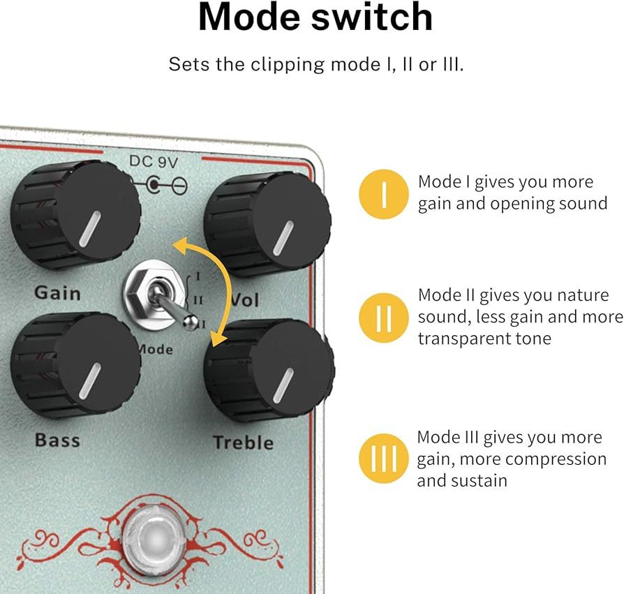 - Mode switch: Sets the clipping mode I, II or Ill. Mode I gives you more gain and opening sound. Mode II gives you nature sound, less gain and more transparent tone. Mode Ill gives you more gain, more compression and sustain.