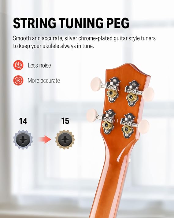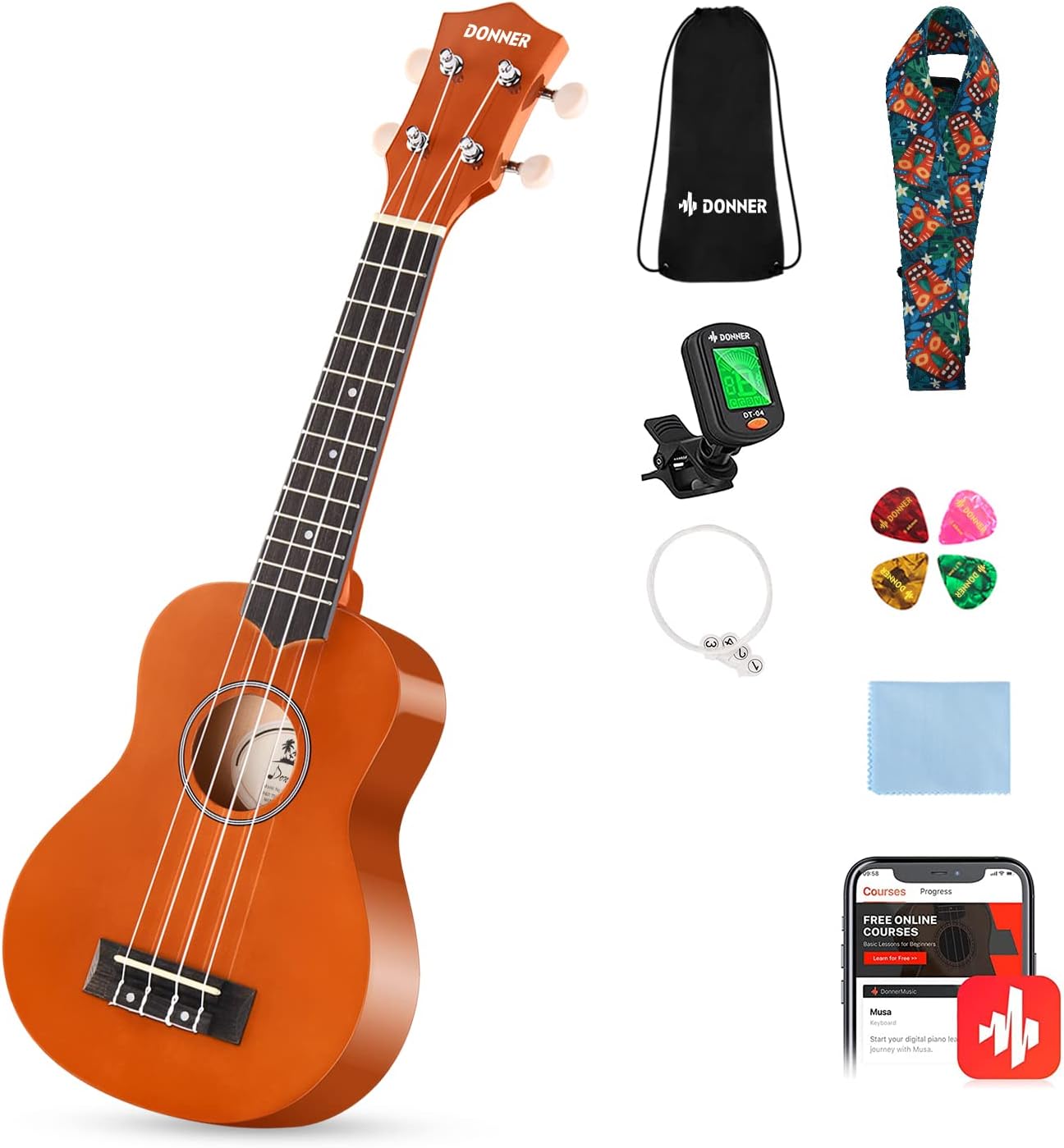 Sopran ukulele sa kvalitetno izrađenim javorovim telom pruža sladak, svetao i topao ton koji traje dugo. Hromirane čivije u stilu gitare omogućavaju stabilno štimovanje i tačnu intonaciju. Instrument ima 12 mesinganih pragova sa oznakama na 5., 7. i 10. pragu na vratu i vrhu hvatnika.Tražite instrument koji je lak za učenje za sebe ili svoju decu? Deca, učenici ili odrasli početnici mogu brzo da krenu sa Donner 21-inčnim ukulelom i besplatnim profesionalnim ONLINE VIDEO časovima. Donner ukulele set uključuje sve što je potrebno početnicima: sopran ukulele, torbu za nošenje, digitalni štimer, kaiš, rezervne žice, 4 trzalice i krpicu za čišćenje.