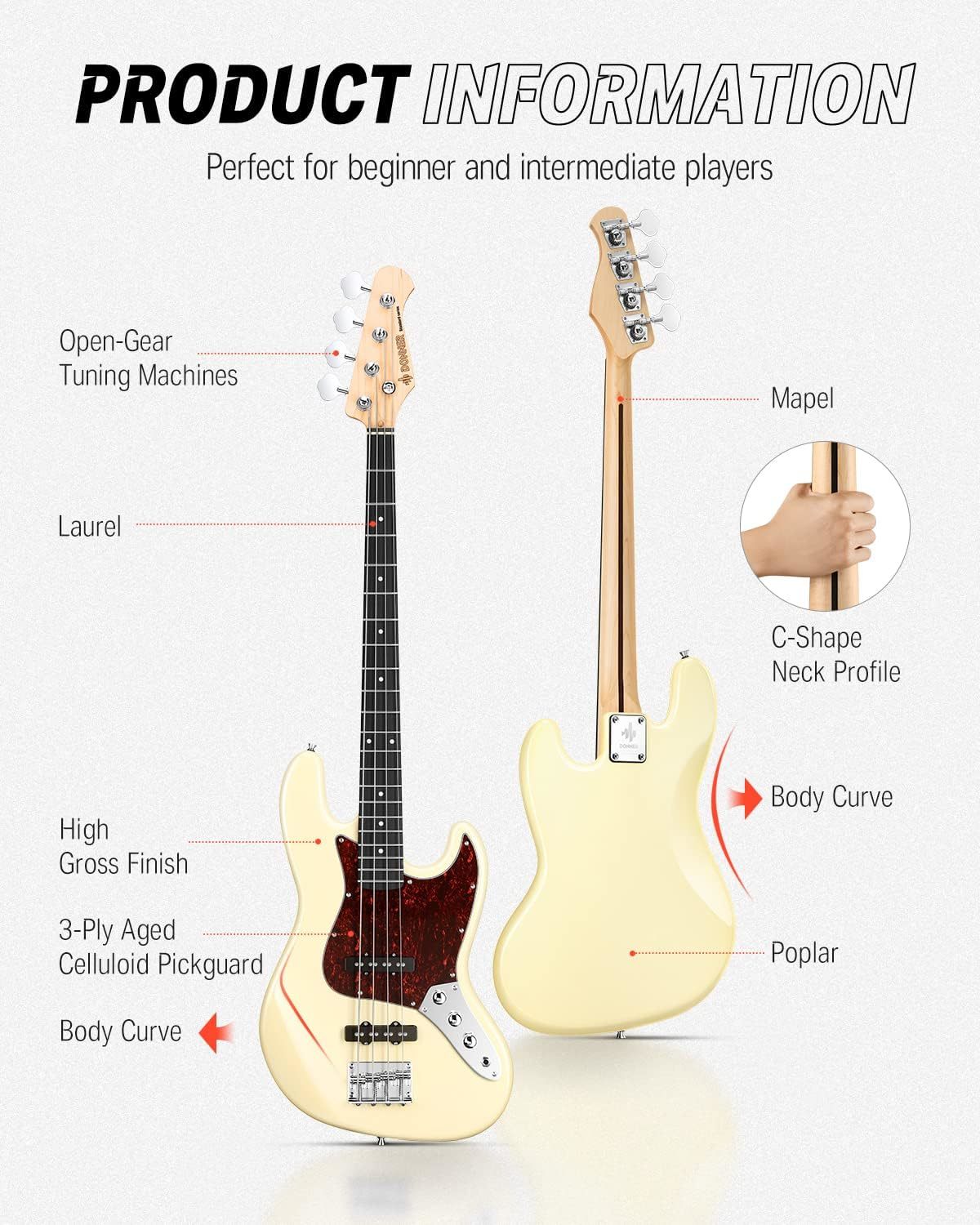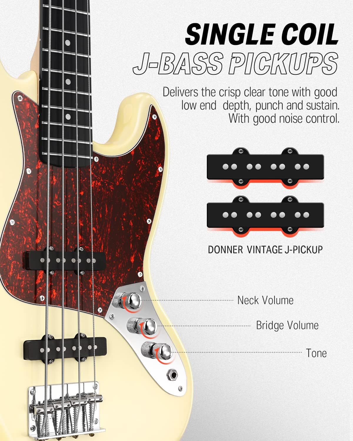 Donner DJB-510B je svestrani električni bas sa 4 žice inspirisan legendarnim Fender Jazz Bassom. Dizajniran da isporuči jasan, bogat zvuk po kojem su poznati Jazz Bass modeli, ovaj električni bas je takođe pogodan za širok spektar muzičkih žanrova, ne samo za džez. Idealan je izbor za početnike koji žele pouzdan bas sa starinskim vibracijama. Dolazi 100% spreman za vas i uključuje torbu za bezbedno transportovanje,kaiš, kabl  i oslonac za prste.
