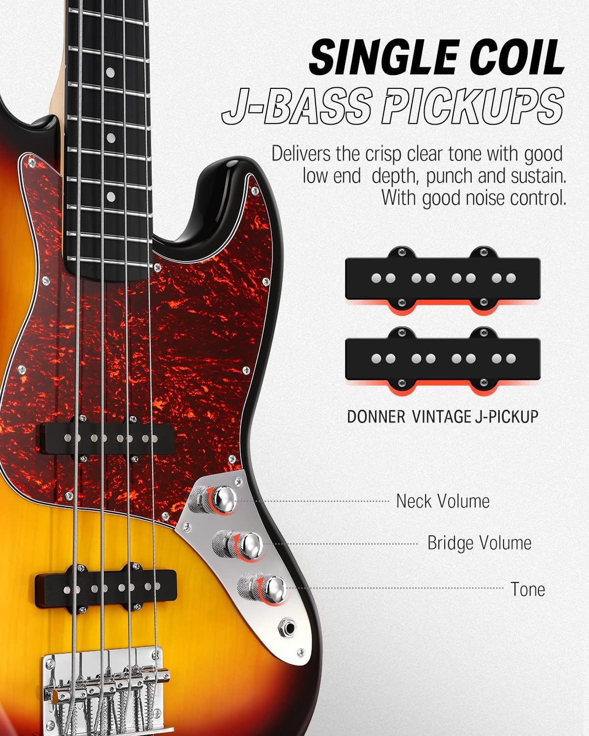 Da bi isporučio jasan i pun zvuk po kojem je poznat ovaj tip električnog basa, Donner DJB-510D je opremljen sa dva Donner džez magneta. Dva magneta imaju individualne kontrole jačine zvuka koje vam omogućavaju da uravnotežite zvuk između dva magneta, dajući vam mnogo mogućnosti da obojite svoj zvuk za žanr muzike koju svirate.