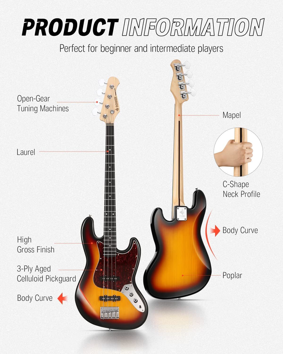 DJB-510D ima 20 pragova od lovorovog drveta i udoban džez bas oblik tela sa konturama koje ga čine da dobro leži uz telo. Dakle, bez obzira da li ustanete i svirate sa priloženim kaišem, ili sedite i vežbate, DJB-510D je udoban, pouzdan i zabavan bas sa odličnim vintage vibracijama.