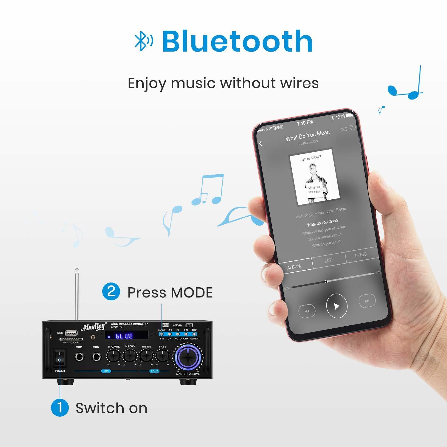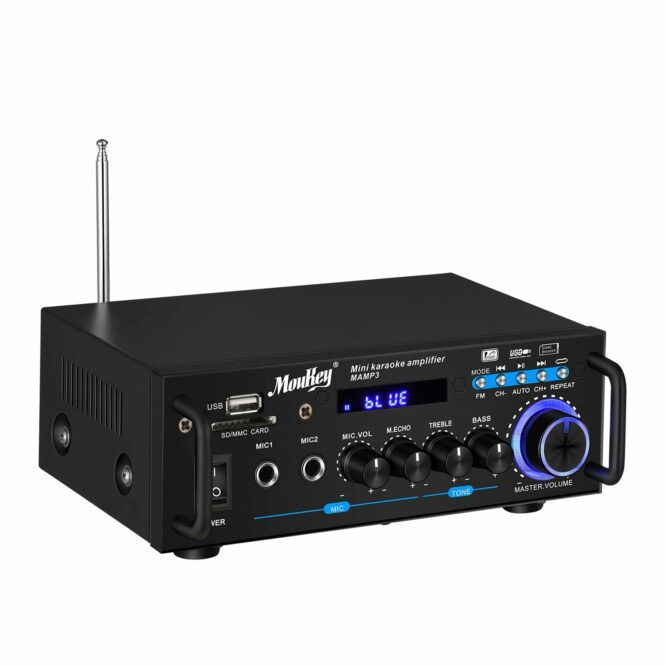 Iako je MAMP3 Desktop pojačalo malo i izvrsno, njegovo pojačalo ima maksimalnu snagu od 100 W. Pored toga, postoje funkcije kao što su čitanje USB-a, SD kartice, FM funkcija pretrage jednim tasterom, bežični Bluetooth, audio i druge funkcije. Takođe postoje i 2 priključka za mikrofon, što vam pruža mogućnost uživanja u karaokama. MAMP3 ima funkciju 4.2 bežične veze sa bežičnim dometom od 12 metara ili više. Može se upariti i povezati sa većinom uređaja (uključujući pametne telefone, iPad, iPhone i PC) sa bežičnom funkcijom. Kada koristite bežičnu vezu, prvo pređite na PLAVI režim i povežite se na ‘MAMP3’. Stereo pojačalo podržava audio/ USB/ bežični ulaz. Lako povežite pojačalo na DVD/TV/PC/STB/MP3 plejer preko audio ulaza. Preko USB ulaza možete povezati pojačalo na USB fleš disk, koji podržava većinu muzičkih formata. Specijalno opremljen sa odvojenim potenciometrima za podešavanje BASS i TREBLE.