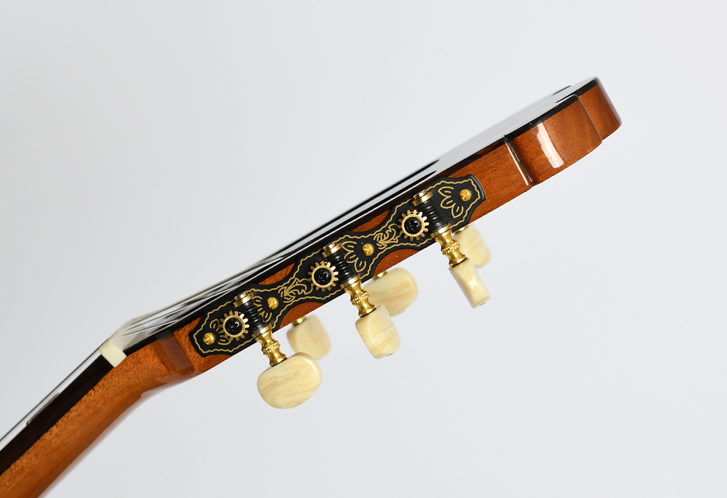 Prednja ploča je od punog drveta kedra a stranice i zadnja ploča su od indijskog palisandera.