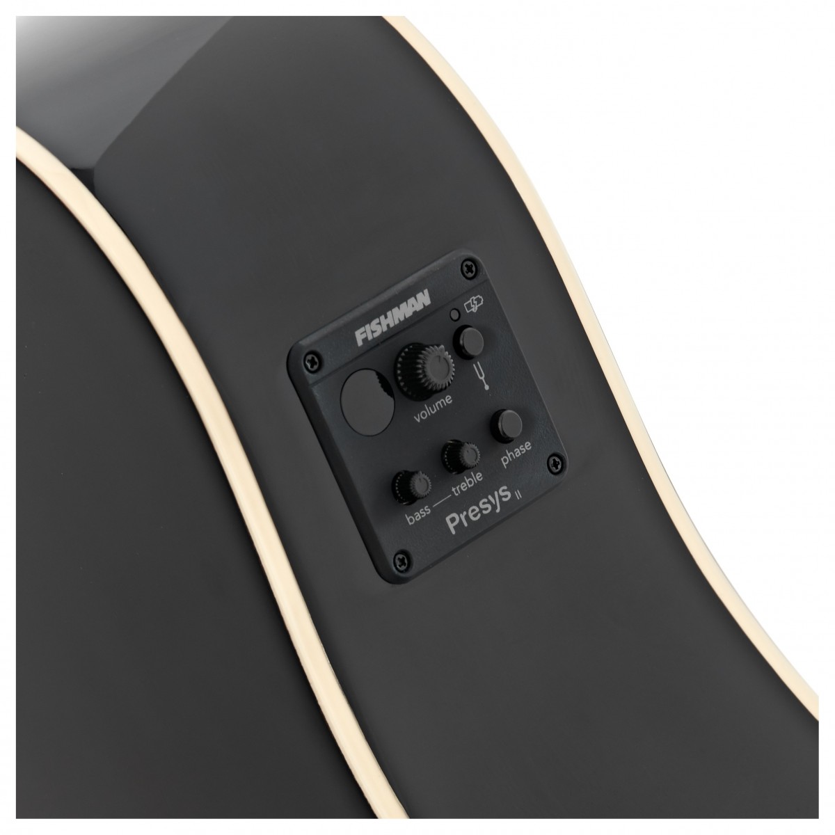 - Controls: Master Volume, Phase (Feedback Cancellation), Treble EQ, Bass EQ, Tuner/Mute Button, Built-in Chromatic Tuner