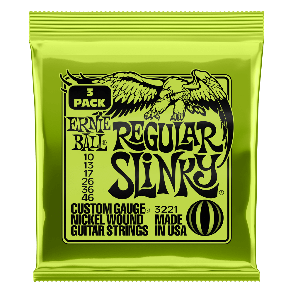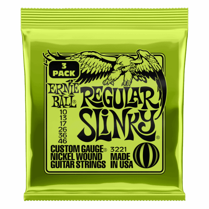 Ernie Ball Regular Slinky 3221 su dostupni u prigodnim pakovanjima od tri seta. Ernie Ball Regular Slinki Electric Strings su najprodavaniji set, a favorizuju ga mnogi muzičari širom sveta. Regular Slinki žice sviraju Erik Klapton, John Maier, Steve Vai …mnogo gitarista širom sveta. Ove žice su precizno proizvedene po najvišim standardima i najzahtevnijim specifikacijama kako bi se osigurala doslednost, optimalne performanse i dug životni vek. Regular Slinki žice izrađene su od niklovane čelične žice omotane oko čelične žice u obliku šestougla, kaljeni čelik je obložen visoko ugljeničnim čelikom koji daje dobro uravnotežen ton za vašu gitaru. Debljina pojedinačno žica je .010, .013, .017, .026, .036, .046
