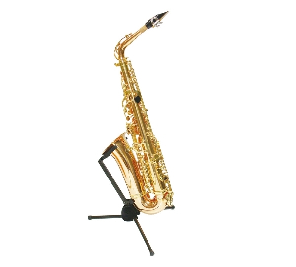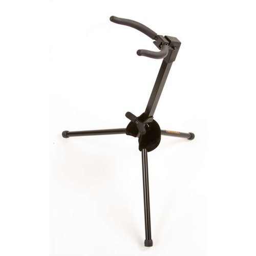 The HERCULES TravLite Alto Saxophone Stand DS431B folds easily and compactly and stores inside the bell of the instrument; velvet pads protect the instrument.