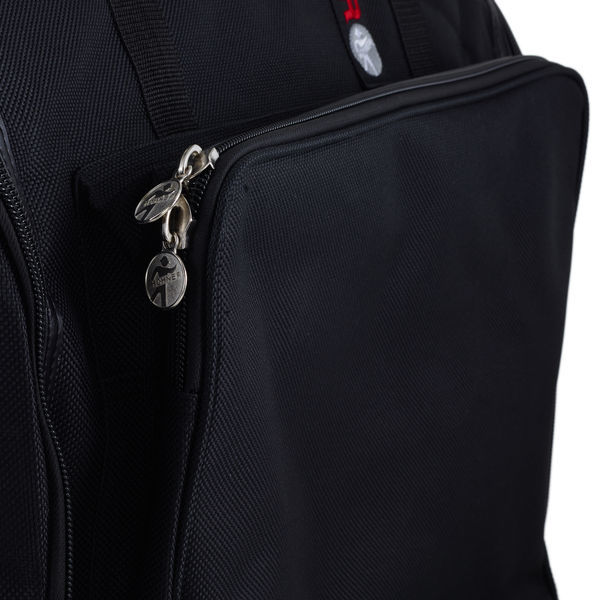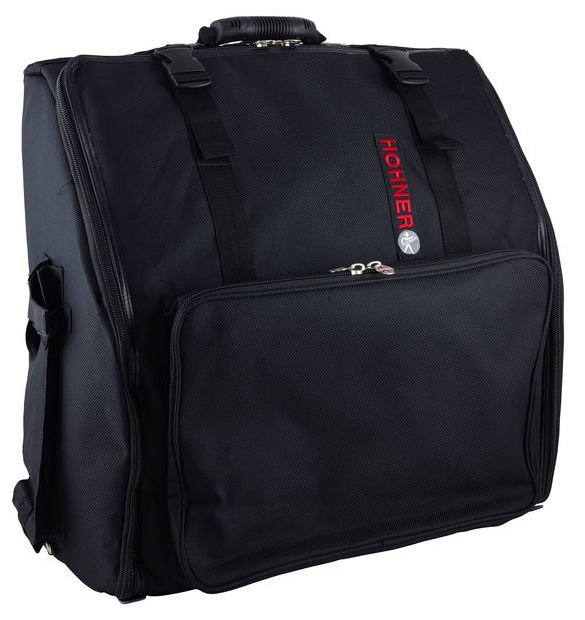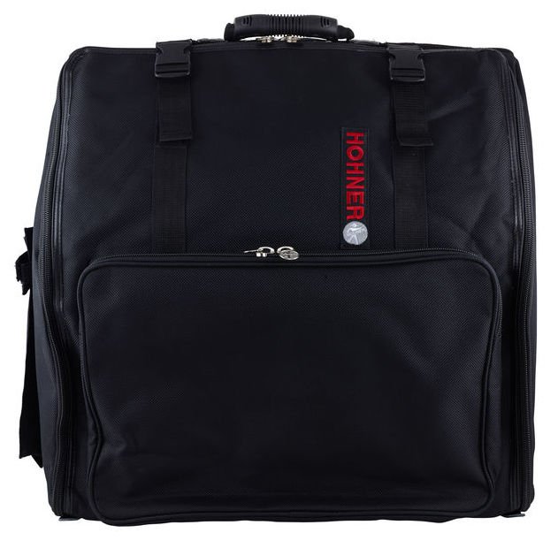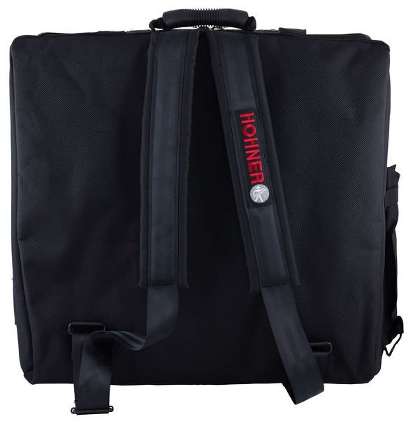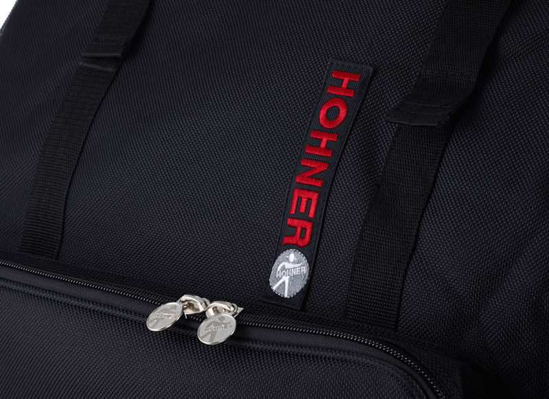 Hohner Gig Bag – for 120 bass and 5 chorus accordion. Tear proof Cordura outer skin with multiple seams, cushioned and stiffened to protect instrument, large pocket for sheet music, additional pocket for notepaper with pen pockets and a holder for a music stand, includes adjustable, cushioned shoulder straps.