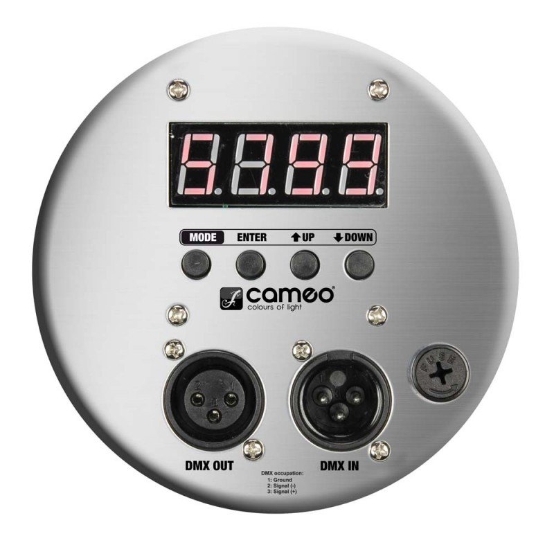 The CLP64RGBA10PS can be controlled in 7-channel DMX mode or in standalone mode, in each case with six functions. It is operated using buttons for mode, enter, up, and down. A 4-position LED display indicates the corresponding setting. XLR sockets serve as DMX in- and outputs for controlling several spotlights in series.
