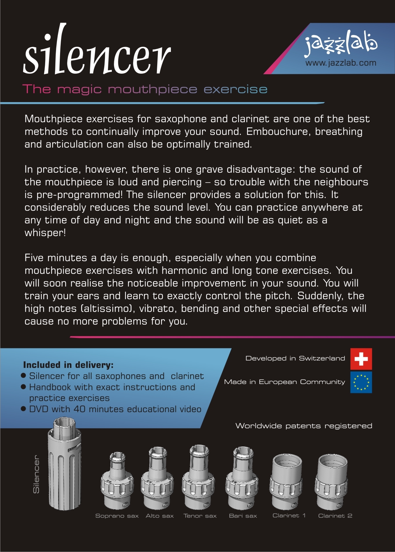 – silencer with couplings for bari sax, tenor sax, alto sax, soprano sax, clarinet 1 and clarinet 2