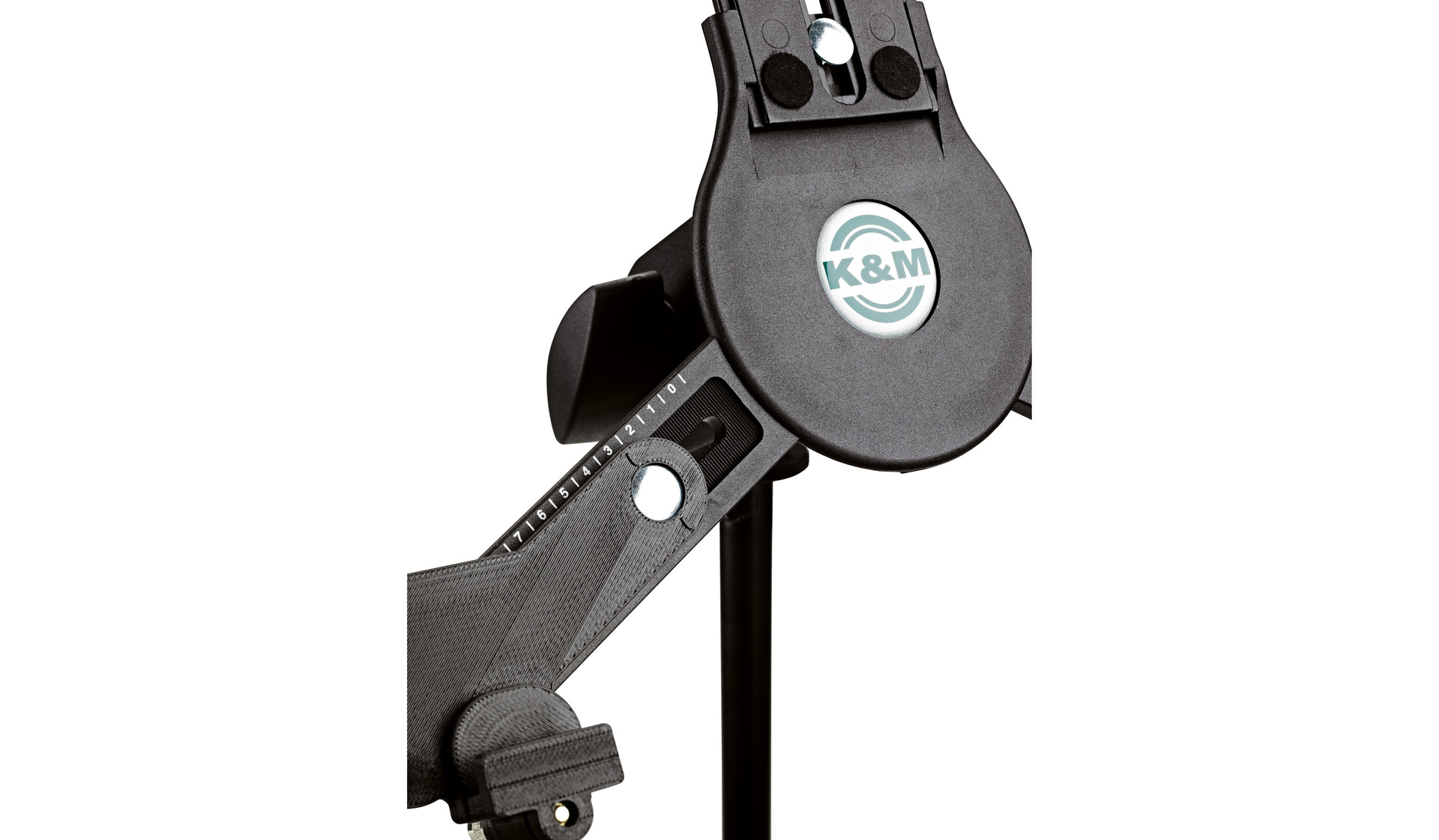 K&M 19790 univerzalni držač za različite tablet modele, iPad, iPad Air, iPad Pro itd. Montira se direktno na vrh mikrofonskog stalka.