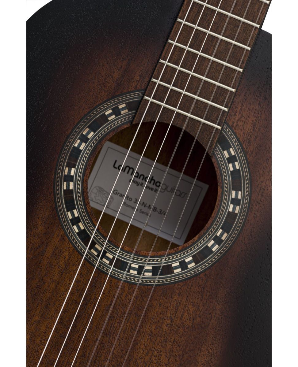 La Mancha Granito 33 N-MB, klasična gitara, veličine 1/2, sa prednjom pločom, pozadinom, vratom od mahagonija, niklovanim čivijama sa crnim dugmićima, je kvalitan instrument za mlaže poćetnike. Zajednička karakteristika La Mancha gitara je da su proizvedene u Aziji, pod budnim okom specijalista, te ne treba čuditi zašto ovako kvalitetni instrmenti po više nego povoljnoj ceni.Boja gitare je mahagoni burst, u mat završnici.