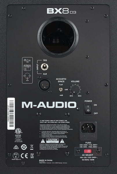 At M-Audio, we understand no two listening spaces are the same. Therefore, the BX8- D3 monitors custom tailors your sound to your environment, so you will always experience sonically-true, reassuringly-accurate sound reproduction. Negate problematic bass frequencies and limit the impact of nuisance standing waves thanks to BX8-D3’s special Acoustic Space control for precise adjustment of BX8-D3’s sound output in line with your studio space.