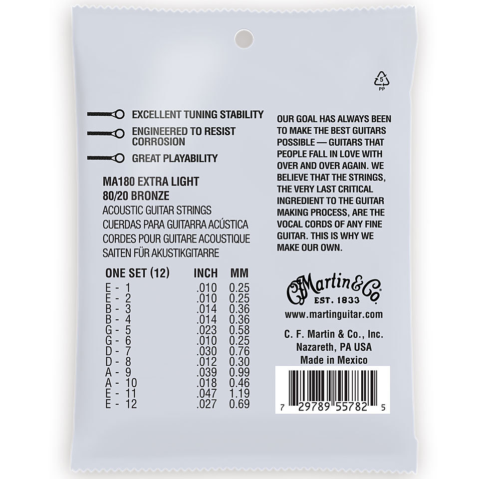 Martin MA180 žice za akustičnu gitaru sa 12 žica. Legura bronza u odnosu 80/20. Extra light tenzija sa debljinom seta 10/10-14/14-23/10-30/12-39/18-47/27