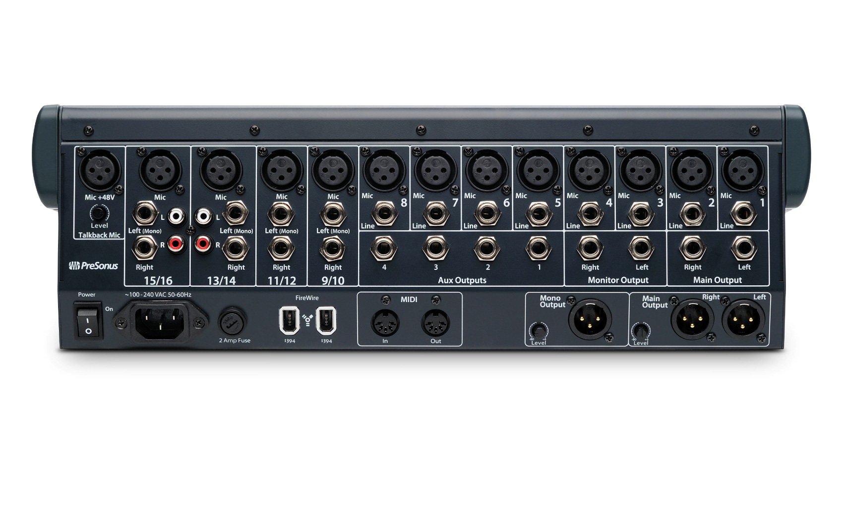 In a “footprint” of less than 2 square feet (0.19 m2), the compact, 16-channel StudioLive 16.0.2 offers 8 mono input channels and 4 stereo channels and provides 12 XMAX™ Class A solid-state mic preamps. (Well, okay, it actually has 13 XMAX preamps; the Talkback input has one, too.)
