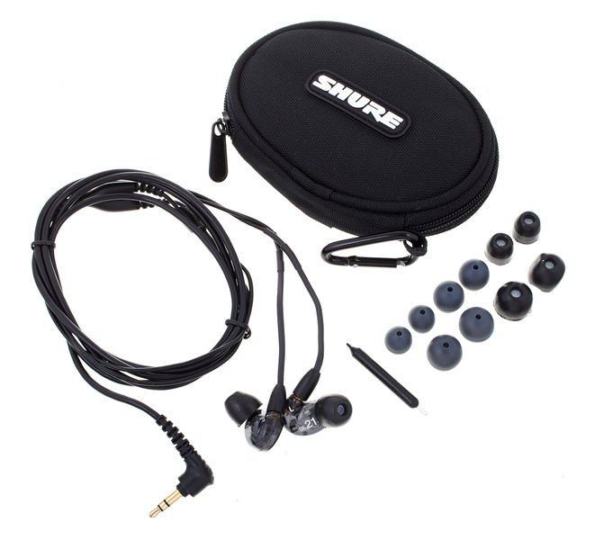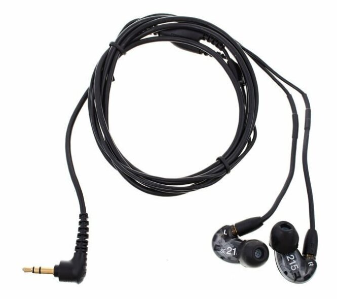 Shure SE215-K dynamic in-ear-phones – impedance: 20 ohms, 107 dB, 22 – 17.500 Hz, black, 162cm cable with 3.5mm gold plated stereo jack. removeable cable, Includes box and selection of different earpads, replacement cable EAC64 not included (optionally available), suitable replacement earpads: EABKF1, EASFX1