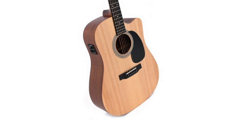 Sigma akustične gitare nude tradicionalni izgled i zvuk poznatog američkog brenda, ali po mnogo pristupačnijoj ceni. Prednja strana ove gitare je izrađena od masivne sitke smrče, dok su bočne i zadnja strana od mahagonija. Vrat od mahagonija, standardno za telo na četrnaestom pragu, je kompozitni rukofvat od mikarte opremljen sa dvadeset pragova. Sedlo je, kao i nulti prag, napravljeno od kosti. Za podešavanje se koriste hromirane čivije. Oko zvučne ploče je ukrasna rozeta. Gitara je opremljena sa sub-coil pickup-om i Fishman aktivnom elektronikom sa dvopojasnim ekvilajzerom, ugrađenim štimerom i zaštitom od povratne sprege.Korišćeni materijali i prijatan osećaj čine ovu gitaru veoma zanimljivim instrumentom koji će sigurno ceniti mnogi svirači.