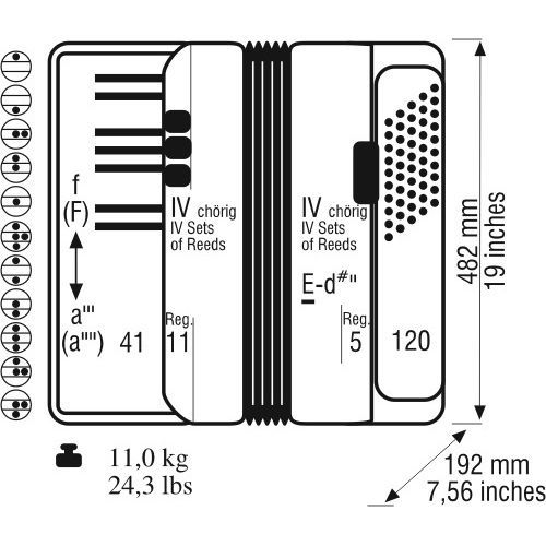 Weltmeister Cassotta 414 je izuzetna klavirna harmonika sa 41 dirkom i 120 baseva. Leva i desna ruka su četvoroglasne.