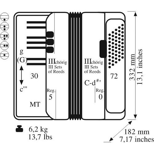 Ova izuzetna klavirna troglasna harmonika sa 72 basa. Izdvaja je to što poseduje uže dirke od 18 mm, pa je zato pogodna za učenje i upoznavanje dece sa instrumentom. Zbog svojih karakteristika pogodna je kako za učenje tako i za sviranje iz hobija.