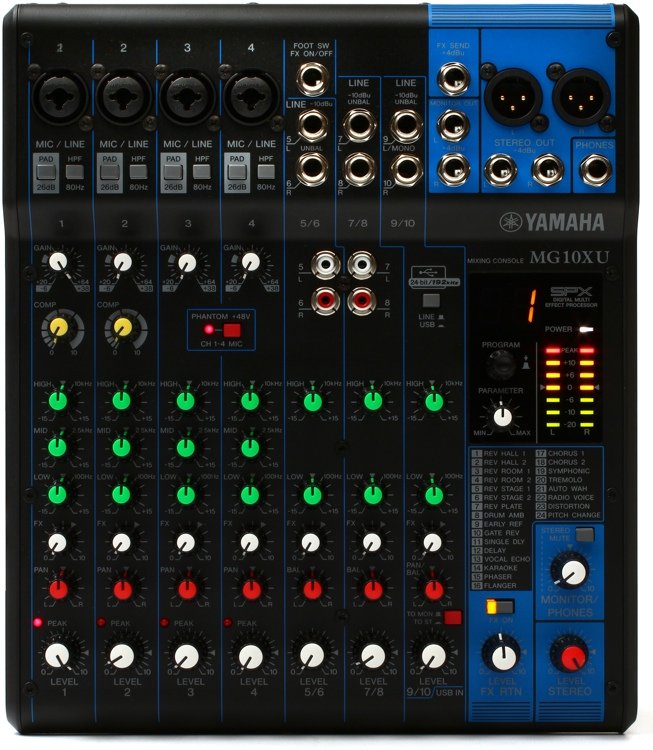 Yamaha MG10XU je 10-to kanalna analogna mikseta sa 4 mikrofonska predpojačivača. SPX procesorom, 24 efekta i veoma kvalitetnim reverbom. USB konekcija za lakse snimanje.